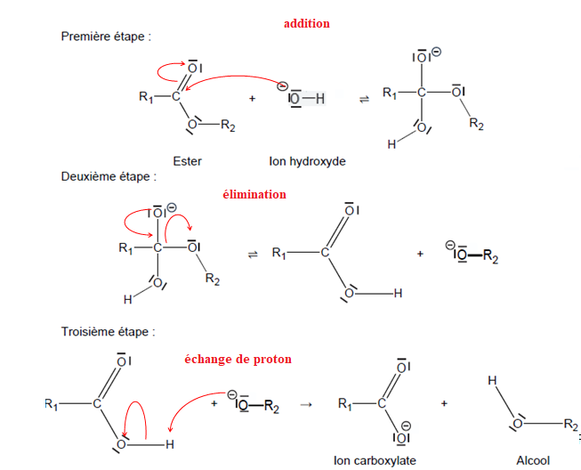 et un ion hydroxyde OH–. Le mécanisme de cette réaction se décompose en trois étapes présentées ci-dessous, où R1 et R2 représentent des chaînes carbonées :