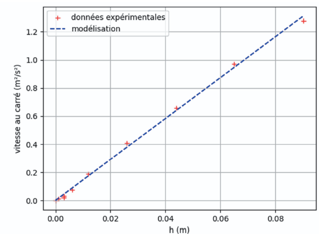observée du carré de la vitesse en fonction de la hauteur de chute h(t)