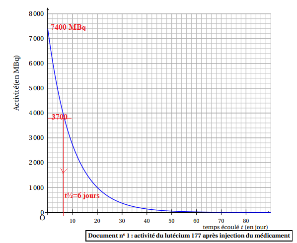 Le document suivant décrit l’évolution au cours du temps de l’activité du lutécium présent dans le médicament injecté au patient.