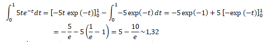Intégration par parties en posant u = 5t et v ' = exp(-t) ; u' =5 ; v = -exp(-t).