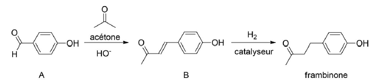 Les deux étapes de la séquence réactionnelle d’un des procédés de synthèse de la frambinone sont représentées ci-après.