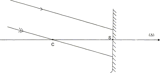 Un miroir sphérique permet de concentrer la lumière d'une source sur la préparation posée sur la platine. Soit (D) l'axe optique principal du miroir et C son centre. En justifiant la réponse, placer sur la figure son foyer principal F. Compléter sur cette figure, la marche des rayons lumineux provenant d'une source lumineuse qui éclaire le miroir. Le foyer est au milieu du segment CS.