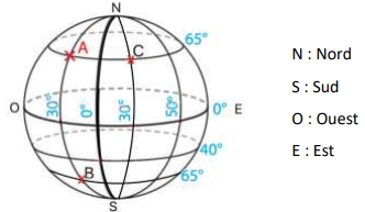 Quel point a pour coordonnées (65° N ; 30°O) ?