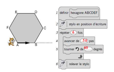 1. Compléter les lignes 3, 4 et 5 afin que le bloc « hexagone ABCDEF »
