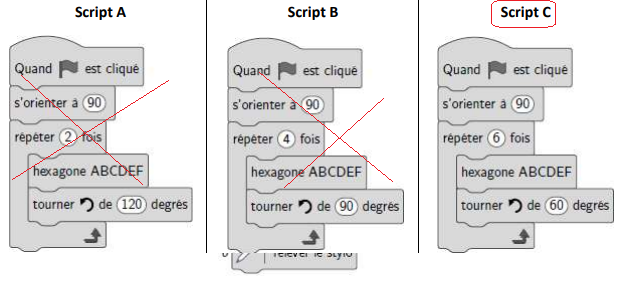 2. Parmi les trois scripts proposés ci-dessous, lequel permet de tracer le motif en utilisant le bloc