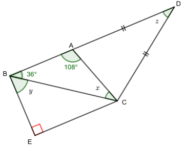108+36+x = 180 ; x = 180-36-108=36 °.