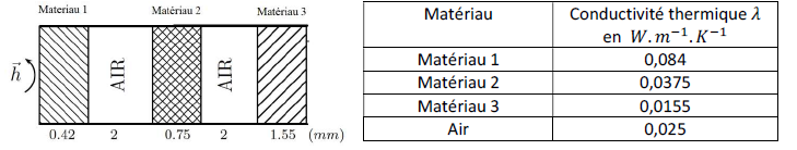 On étudie un manteau antifeu tri-couches décrit par le schéma ci-dessous, donnant l’épaisseur de chaque couche en