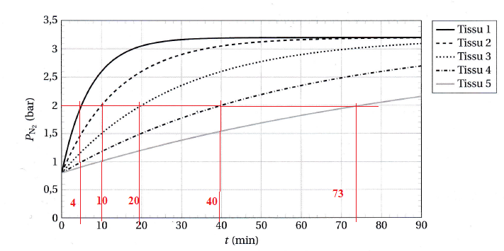 Pression du diazote dans le sang au bout de 30 min, tissu 1: P1=3,2 bar = 3,2 105 Pa.