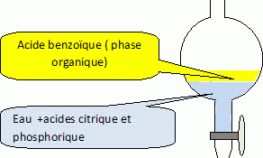- le toluène et l’eau ne sont pas miscibles. - l’acide phosphorique et l’acide citrique sont solubles dans l’eau. Extraction de l’acide benzoïque. On souhaite connaître la quantité d’acide benzoïque présente dans une boisson au cola en réalisant un titrage acido-basique. En dehors de l’acide benzoïque, la boisson contient également de l’acide phosphorique et de l’acide citrique, ainsi que de l’eau. Il s’agit donc, dans un premier temps, de séparer l’acide benzoïque, que l’on souhaite titrer, des autres acides. Dans un bécher on place un volume V = 100 mL de boisson et on laisse sous agitation magnétique pendant une heure afin d’éliminer le dioxyde de carbone dissous. On ajoute alors environ 100 mL de toluène dans le bécher On verse ensuite le mélange dans une ampoule à décanter.
