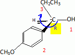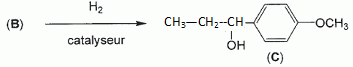 Etape 3. La molécule B est soumise à l'action de dihydrogène gazeux en présence de catalyseur métallique pour conduire au composé C selon le schéma réactionnel donné ci-dessous : ![]() Préciser le type de réaction mise en jeu. Réduction ( Hydrogénation catalytique ) de la fonction cétone en alcool. Entourer les fonctions organiques présentes dans la molécule C. Préciser éventuellement leur classe. ![]() En raison de la présence d'un atome de carbone asymétrique dans la molécule C, cette dernière est obtenue sous forme d'un mélange racémique. Donner la définition d'un mélange racémique. Mélange en proportions égales des énantiomères lévogyre et dextrogyre d'une molécule chirale. Représenter le stéréoisomère de configuration R en explicitant les règles suivies. Numéroter de façon décroissante chacun des quatre substituants selon son numéro atomique. (1) -OH ; (2) cycle ; (3) CH2-CH3 ; (4) H. On place alors l'atome (ou le groupement) de numéro le plus élevé derrière. On regarde dans quel sens, sens horaire ou trigonométrique, on passe du numéro 1, au 2, au 3. - Si le sens de rotation est le sens horaire (ou anti-trigonométrique), le carbone est Rectus (R), - Si le sens de rotation est le sens trigonométrique (ou anti-horaire), le carbone est Sinister (S). ![]()
