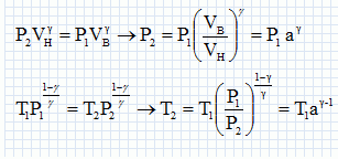 Paramètrage du cycle. Soient a = VB/VH le rapport volumétrique ; b = P3/P2, la surpression et r = V4/VH le rapport de surchauffe. Exprimer les chaleurs Q23 et Q34 fournies par la combustion du carburant en fonction de n, R, g, T2, T3 et T4. 1- 2 : compression adiabatique réversible donc Q12=0. 2- 3 : isochore : le travail échangé est nul ; la variation d'énergie interne du gaz est égal à Q23. L'énergie interne d'un gaz parfait ne dépend que de la température d'où Q23 = nCv,m (T3-T2) avec Cvm = R / (g-1). 3-4 : isobare réversible : la variation d'enthalpie est égale à Q34. Q34 = n Cp,m( T4-T3) avec Cpm = R g/ (g-1). 4-5 : détente adiabatique réversible donc Q45=0. 5-1 : détente isochore : le travail échangé est nul ; la variation d'énergie interne du gaz est égal à Q51. L'énergie interne d'un gaz parfait ne dépend que de la température d'où Q51 = nCv,m (T1-T5). Exprimer le rendement h en fonction uniquement des chaleurs des phases utiles du cycle. Travail fourni au cours du cycle : W énergie mise en jeu au cours du cycle : Q23 + Q34 + Q51. La variation d'énergie interne est nulle sur le cycle : W+Q23 + Q34 + Q51=0 -W = Q23 + Q34 + Q51 h= [Q23 + Q34 + Q51] / [Q23 + Q34] = 1+Q51 / [Q23 + Q34] Exprimer le rendement en fonction de g et des cinq températures T1 à T5 exclusivement. ![]() Exprimer T2 et P2 en fonction de P1 et T1 respectivement, et de a et g. La transformation 1-2 est adiabatique réversible. V1 = VB et V2 = VH. ![]() Exprimer T3 et T4 en fonction de T1, a, b, r et g. La transformation 2-3 est isochore d'où : P3/T3 =P2 / T2 soit P3/P2=T3/T2 =b. T3= bT2 = bT1 ag-1. La transformation 3-4 est isobare d'où : V3/T3=V4/T4 soit V4/V3=T4/T3 =T4/TH = r. T4= rT3 = rbT1 ag-1. Exprimer T5 en fonction de T1, b, r et g. La transformation 4-5 est adiabatique réversible : T5 V5g-1 = T4 V4g-1. La transformation 5-1 est isochore : V5 = V1 = VB soit T5 VBg-1 = T4 V4g-1. T5 = T4 [V4 /VB ]g-1. Or a = VB /VH ; r = V4 /VH d'où V4 /VB = r / b ; par suite : T5 = T4 [ r / a ]g-1 = rgbT1. En déduire l'expression du rendement : ![]() T1-T5 = T1[ 1-rgb] T3-T2 = bT1 ag-1-T1 ag-1 = T1[ b -1]ag-1. T4-T3 = rbT1 ag-1- bT1 ag-1 =T1[ r -1]bag-1. g(T4-T3) =T1[ r -1]gbag-1.