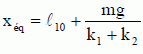 Forces, énergies, oscillateurs. On considère dans le champ de pesanteur terrestre l’ensemble constitué d'un objet M de masse m supposé ponctuel, solidaire de deux ressorts fixés verticalement à des bâtis, comme le montre la Figure 2. Les ressorts ont des masses que l’on néglige. Le ressort supérieur R1 a une raideur k1 et une longueur à vide l10 , le ressort inférieur R2 a une raideur k2 et une longueur à vide l 20 . La longueur H entre les points d’attache de chacun des ressorts à leur bâti est égale à la somme des longueurs à vide des ressorts. Si O est pris comme origine d’un axe vertical descendant Ox de vecteur unitaire ux est la coordonnée repérant l’objet M. Le référentiel du laboratoire où ont lieu les expériences est supposé galiléen. L’ensemble est soumis à l’accélération de la pesanteur g. Les frottements sont négligés dans un premier temps. ![]() L’ensemble est à l’équilibre. La coordonnée de l’objet M est alors xéq. Faire un schéma des forces qui s’exercent sur l’objet M à l’équilibre. Donner l’expression vectorielle de chacune des forces. Montrer que l’expression de xéq est : ![]() ![]() L’objet M est mis en mouvement en l’élevant un peu depuis la coordonnée d’équilibre et puis en le lâchant sans vitesse initiale. Décrire qualitativement le mouvement de l’objet. Mouvement rectiligne périodique sinusoïdal non amorti ( oscllateur harmonique ). Quand l’objet est à la coordonnée x, réécrire les expressions des forces qui s’exercent sur lui et montrer que leur résultante peut se mettre sous la forme : (1)![]() On introduit la variable X(t) = (x(t) – xéq). Montrer que l’équation différentielle vérifiée par la variable X(t) s’écrit : X" + w20X=0 (2). Ecrire la seconde loi de Newton sur l'axe Ox : -(k1+k2) X = mX" X" + (k1+k2) / m X=0 ; on pose w20= (k1+k2) / m. Donner la solution X(t) de l’équation (2) si l’objet est lâché sans vitesse initiale depuis la coordonnée x = l10 . En déduire l’expression de x(t). Faire un graphe de x(t). X(t) = A cos (w0t+F), A et F sont des constantes déterminées par les conditions initiales. X(0) = l10-xéq= A cos F ; d'où F =0 et A = l10-xéq= -mg / (k1+k2). X(t) = -mg / (k1+k2)cos (w0t) et x(t) = X(t)+ xéq= ( l10-xéq)cos (w0t) +xéq. ![]()