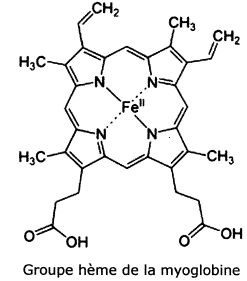 La myoblobine est fixée à un groupe hème, groupe au sein duquel l'ion fer II est complexé par le ligand protoporphyrine IX.