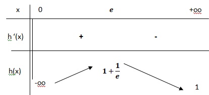 Sur ]0 ; e[, h(x) et continue et strictement croissante de -oo à 1+1 /e.