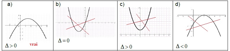 • Question 4 : Les figures ci-dessous représentent quatre polynômes du second degré dans un repère orthonormé et le signe de leur discriminant D. Parmi ces propositions, laquelle est juste ?