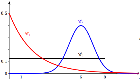 On a représenté ci-dessous les représentations graphiques des densités des trois lois décrites