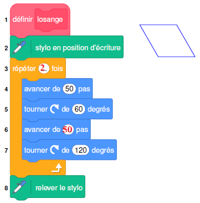 1. On souhaite tracer le losange ci-dessous de côté 50 pas à l’aide du bloc losange.