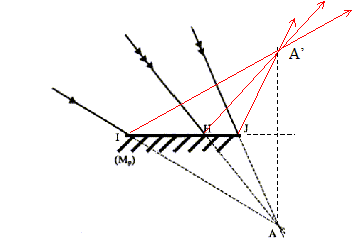 rayons réfléchis correspondant aux rayons incidents extrêmes passant par I et J ainsi qu'au rayon intermédiaire passant par H. Construire A' symétrique de A par rapport au plan du miroir ; l'angle d'incidence étant égal à l'angle de réflexion, tous les rayons réfléchis à construire passe par A'.