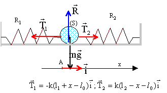 longueur de R1 : l1+x = l0+L+x ; allongement : L+x longueur de R2 : l2-x = l0+ L-x ; allongement : L-x la seconde loi de Newton s'écrit en projection sur l'axe Ax : -T1 + T2 = mx" -k(L+x) + k(L-x)=mx" 2kx=mx" soit x" + 2k/m x=0 ; on pose w²= 2k/m ; w = 2pf soit f = 1/(2p)[2k/m]½ ; T0= 1/f = 2p[2k/m]-½ solution de l'équation différentielle : x(t) = Xm cos ( 2pt/T0+F) ; x'(t) = -Xm 2p/T0sin ( 2pt/T0+F) ; x"(t) = -Xm(2p/T0)² cos ( 2pt/T0+F) repport dans l'équation différentielle : -Xm(2p/T0)² cos ( 2pt/T0+F) +2k/m Xm cos ( 2pt/T0+F) =0 vérifiée quel que soit t si : (2p/T0)² = 2k/m soit T0= 1/f = 2p[m/(2k)]½ Détermination graphique de la période T0 et l'amplitude : 4 périodes correspondent à 0,3 s d'où T0 = 0,075 s. Amplitude : 30 mm = 0,03 m valeur approchée de la constante de raideur k : k= ½(2p/T0)² m = 0,5*4 p ² *6,24 10-2 / (7,5 10-2)² = 2 p ²*624/ 7,5² = 222 N/m. représentation graphique des couples de points (x, x") : équation différentielle : x" + w² x=0 soit x" = - w² x, droite de coefficient directeur - w². w² = 200 103 / 29 = 2 105/29 =6896 ; or w² = 2k/m soit k = 0,5 *0,0624*2 105/29 = 6240/29 = 215 N/m. expression de l'énergie mécanique E : énergie potentielle élastique : ½(2k)x² ; énergie cinétique : ½mv²=½mx'² ; énergie mécanique : E= ½(2k)x² + ½mx'² conservation de l'énergie : E= ½(2k)x² + ½mx'² ; x² + m/(2k) x'² =E/k ; (x'/w)²+x²=E/k = C expression de C en fonction de l'amplitude Xm : si x=Xm l'énergie mécanique est entièrement sous forme d'énergie potentielle élastique E= ½(2k) Xm² d'où C= Xm² = 9 10-4 m². A partir de l'expression de E, retrouver l'équation différentielle : E= ½(2k)x² + ½mx'² ; dériver par rapport au temps : 0 =2k x x' + mx' x" ; 2kx+mx"=0 ; x"+2k/m x=0 représentations graphiques des couples (t,E) ou (x²,(x'/w)²) : le second graphique correspond à E=f(t) = constante ( droite horizontale). le premier graphique correspond à (x'/w)² = C-x² ; (x'/w)² =f(x²) fonction affine
