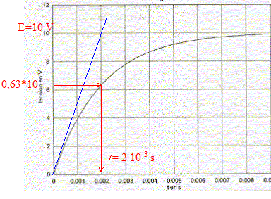 L'enregistrement 1 ( à gauche) correspond à la tension uC : celle-ci est croissante de zéro à E lors de la charge. L'enregistrement 2 ( à droite) correspond à la tension uRG : l'intensité ( donc uRG qui est égale à RGi) décroît au cours de la charge. Additivité des tensions : E = uC +uRG. relations entre i et q : i = dq/dt ; entre q et uc : q=Cuc ; dq/dt = Cduc/dt. Equation différentielle satisfaite par la tension uc(t) : E = uC +uRG ; E = uC +RGi ; E = uC +RGCduc/dt. (1) Vérifions que uc(t) = E(1-exp(-t / (RGC))) est solution de cette équation : dériver uc(t) par rapport au temps : duc/dt = E/(RGC)exp(-t / (RGC)) repport dans (1) : E(1-exp(-t / (RGC))) + E exp(-t / (RGC)) = E relation vérifiée quel que soit t : donc uc(t) = E(1-exp(-t / (RGC))) est bien solution de (1). Expression littérale de la constante de temps t du circuit : t = RGC. Détermination graphiqu de t :