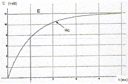 I. Charge du condensateur Le condensateur étant déchargé, on place à t = 0, l'interrupteur K en position 1. Un système d'acquisition permet d'enregistrer les graphes des tensions E et uC en fonction du temps. On obtient les courbes :