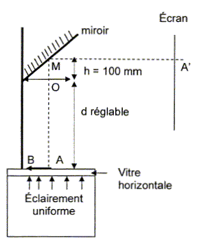 La lentille L donne une image intermédiaire A1B1 d'un objet AB et le miroir plan fournit une image définitive A'B' sur l'écran. Le centre optique O de la lentille est situé à une distance h = 100 mm du point M du miroir. Lorsque la distance OA = d réglable est fixée à OA = d = 400 mm, on obtient une image définitive A'B' sur un écran placé à une distance MA' = 1,40 m. ( M : centre du miroir ) Le schéma correspondant à cette situation est représenté ci-dessous ; y sont représentés l'objet AB, l'image intermédiaire A1B1 et l'image définitive A'B'.
