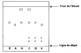 et mobile ( l'éluant) E et A sont des corps purs de référence. H, C, B et V sont des mélanges. H, C et B contiennent de l'estragole E ; V contient de l'anéthole A Rapport frontal Rf de l'estragole :