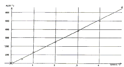 facteur de dilution : F= 12/2,4 = 5 prélever 50 / 5 = 10,0 mL de S0 à l'aide d'une pipette jaugée + pipeteur. Placer dans une fiole jaugée de 50 mL et compléter avec de l'eau distilée jusqu'au trait de jauge. Agiter pour rendre homogène. La valeur de la longueur d'onde doit correspondre au maximum d'absorption del'indigo soit l =650 nm. Il faut faire un réglage du "zéro d'absorbance " en plaçant dans la cuve le solvant pur.