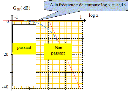 Déterminer le comportement asymptotique de GdB, c'est à dire l'expression simplifiée de GdB pour x<<1 ( basse fréquence) et pour x>>1 ( haute fréquence). x<<1 : GdB ~ -10 log 1 ~ 0. x>>1 : GdB ~ -10 log x4 ~ -40 log x.