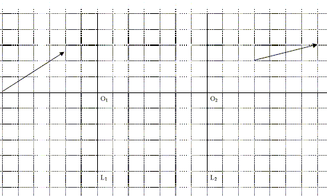 Etude d’un doublet comportant deux lentilles L1 et L2, de centres O1 et O2 représenté ci-dessous : Sur la gauche un rayon incident pénètre dans le système et émerge sur la partie droite, comme indiqué sur la figure. Un carreau correspond à un centimètre.