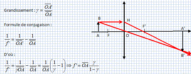 Calculer f'. f' = -1,2*(-2)/3 = 2,4/3 = 0,8 m. Calculer AA' et en déduire la distance entre l'objet et l'image. AA' = AO +OA' =-OA +gOA =OA(g-1) = -1,2(-3) = 3,6 m. Distance objet-image : 3,6 m.