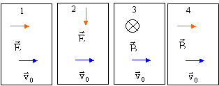 Un électron de mouvement rectiligne uniforme de vitesse v0 pénètre dans une région D de l'espace où règne soit un champ électrique, soit un champ magnétique, tous deux sont supposés uniformes. On se propose d'analyser l'action de ces champs sur le mouvement de l'électron dans différentes situations schématisées ci-dessous. On admettra que l'électron est soumis aux lois de la mécanique classique et que son poids est négligeable devant les autres forces mises en jeu. Sa masse sera noté m et sa charge q=-e ![]()