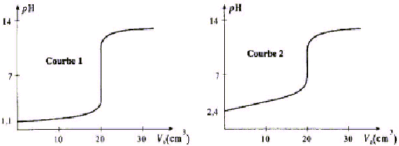 corrigé 1 est faux : courbe 1 : le pH à l'équivalence vaut 7 , donc dosage HCl par NaOH 2 est vrai : à l'équivalence (courbe 1): C'a V'a = CbVb Cb = 0,1*20/20 = 0,1 mol/L 3 est faux : à l'équivalence (courbe 2): Ca Va = CbVb Ca = 0,1*20/30 = 0,067 mol/L 4 est faux : à la demi-équivalence (courbe 2) pH=pKa proche de 4. |