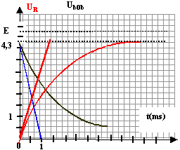 uR = Ri et ubob = ri + L di/dt = r i + L i'. E = uR +ubob = (R+r) i + L i'. l'équation différentielle s'écrit : i' + (R+r)/ L i = E /L. or uR / R = i soit i' = u'R / R u'R / R + (R+r)/(RL) uR = E /L u'R + (R+r)/L uR = RE /L (1) comment trouver la constante de temps ? à partir de uR = E R/ (R+r) (1 - exp (-t/t)) on dérive pour obtenir u'R : u'R = E R/ ((R+r)t) exp (-t/t) repport dans (1) : E R/ ((R+r)t) exp (-t/t) + E R / L (1-exp (-t/t) ) = RE / L R/ ((R+r)t) exp (-t/t) +R/L -R/Lexp (-t/t) = R/L R / ((R+r)t) exp (-t/t)-R /L exp (-t/t) ==0 1 / ((R+r)t) = 1/L soit t = L/ (R+r). lecture graphe : l'intersection de la tangente à l'origine ( courbe rouge) avec la droit horizontale passant par 4,3 V donne la valeur de t soit environ 10-3s.