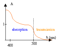 l'absorption est importante entre 380 et 500 nm ; la solution absorbe le bleu et le vert. la couleur de la solution sera la couleur complémenrtaire du bleu , soit le jaune orange. la transmission est importante entre 500 et 600 nm aspect du spectre de bande d'absorption :