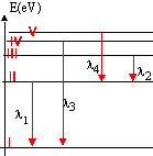 Données : célérité de la lumière dans le vide :3 108 m/s; constante de Plank : h=6,62 10-34 Js ; charge élémentaire : e = 1,6 10-19 C ; masse de l'électron m = 9 10-31 kg. La figure ci dessous représente un diagramme très simplifié des niveaux d'énergie de l'atome de lithium de numéro atomique Z=3, de formule électronique K2L1. ![]() On considère les quatre transitions représentées sur le diagramme. Les longueurs d'ondes correspondantes sont l1 = 671 nm ; l2 = 812 nm ; l3 = 323 nm et l4 = 610 nm.