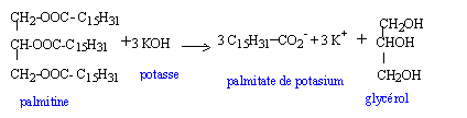 2. Ecrire l'équation bilan de la réaction entre la potasse KOH et la palmitine. On obtient du palmitate de potassium; donner le nom de l'autre produit formé.