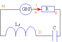 Un circuit comprend, montés en série, un conducteur ohmique de résistance R=10 ohms, une bobine d’inductance L = 10mH et de résistance r =2,5 ohms, un condensateur de capacité C= 10 mF, un générateur basse fréquence (GBF) délivrant une tension sinusoïdale, réglable en fréquence, et de valeur efficace constante U=5 V . ![]() Étude de la résonance