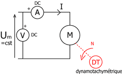 i = iTh1 - iD1 Pour mesurer sa valeur efficace, on utilise un ampèremètre numérique TRMS sur la position AC + DC ou un ampèremètre ferromagnétique. On mesure la valeur moyenne avec un voltmètre analogique magnétoélectrique sur la position DC ou avec un oscilloscope p(t) = uC(t) . iC(t) <p(t)> = P = <uC(t) . iC(t)> = <uC(t)> . IC P = U2 / p (1+cosq0)XC. Cette puissance est maximale pour q0 = 0 Cette puissance est minimale pour q0 = 180° Etude du moteur à courant continu à excitation série : Schéma de principe permettant de relever I = f(N) à Um = Cste.